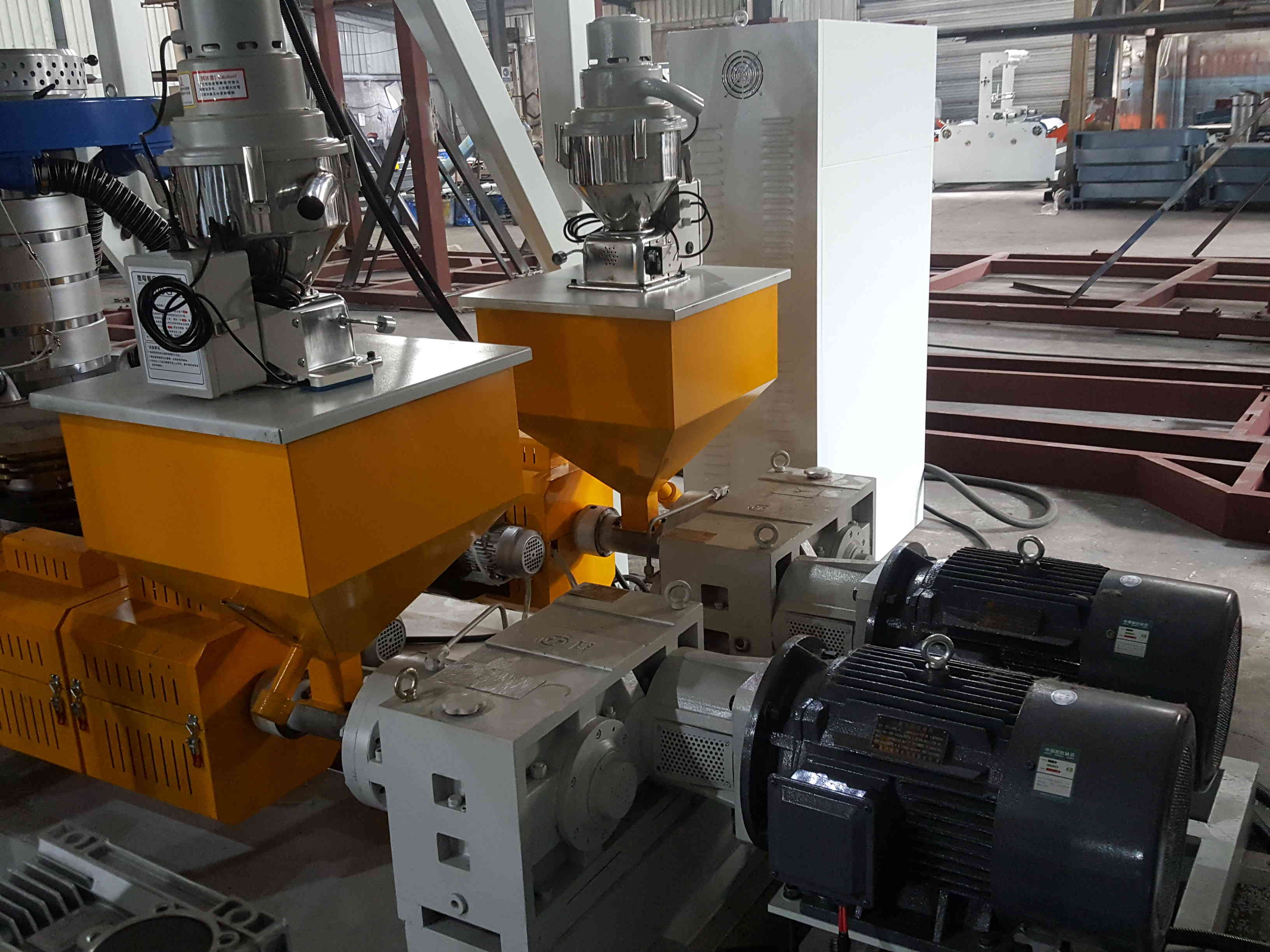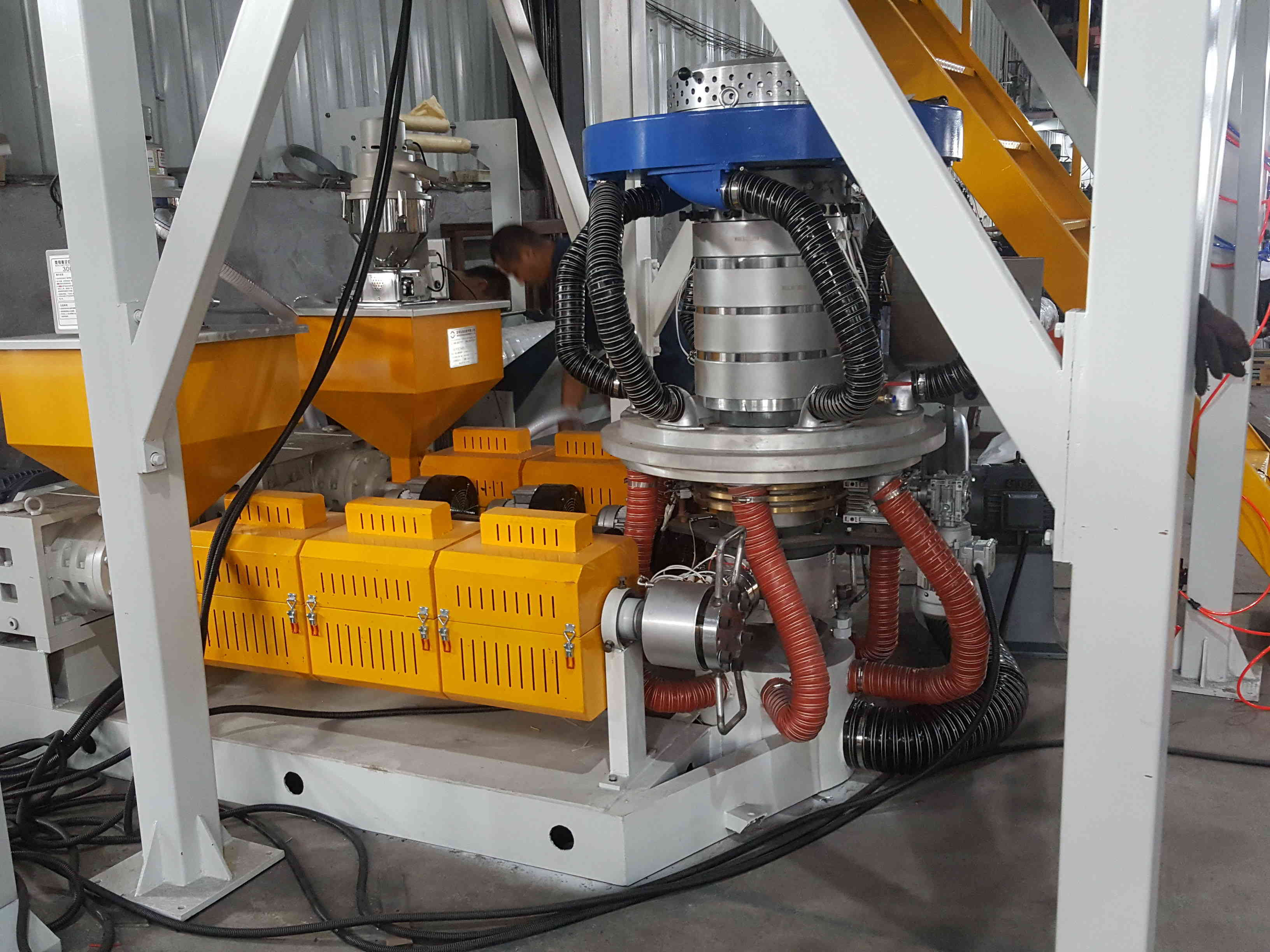 This machine Both the cylinder and the screw of the extruder are made of high quality alloy steel through nitration and precision finishing with the best hardness and corrosion resistance.,Scientifically designed, this machine set has two heads for one extruder with such advantages as increasing production capacity, saving energy, labour and workshop area, etc.