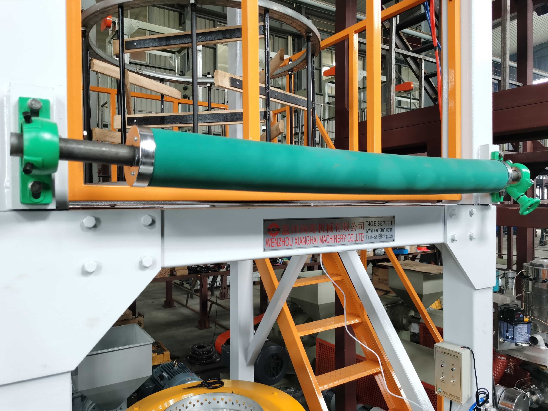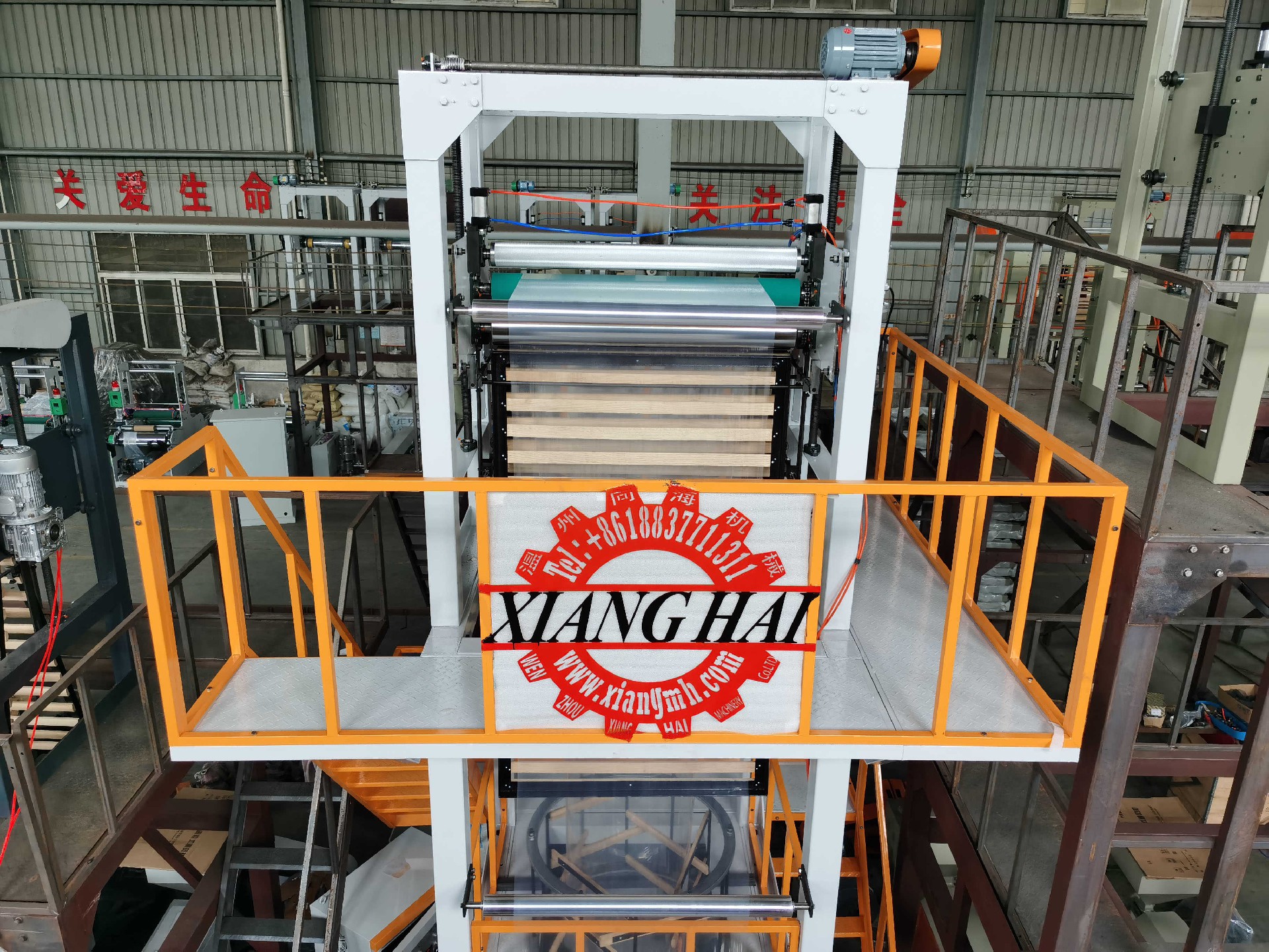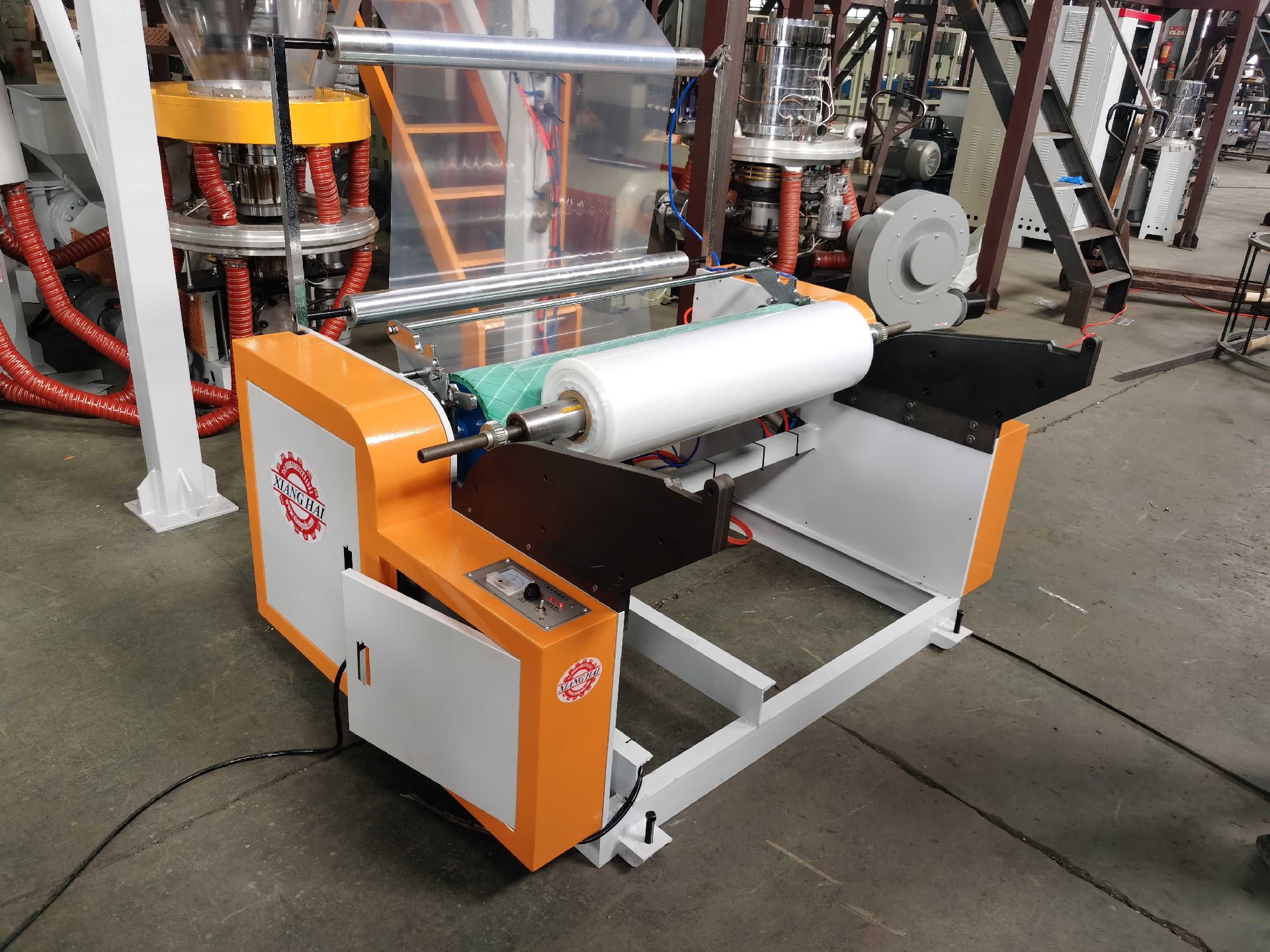 It is the plastic film blowing machine for blowing PE(HDPE, LDPE, LLDPE), film; film are widely used for packing liquid, industrial products, garments and textile; for making plastic bags, like T-shirt bag, flat bags, garbage bags etc.