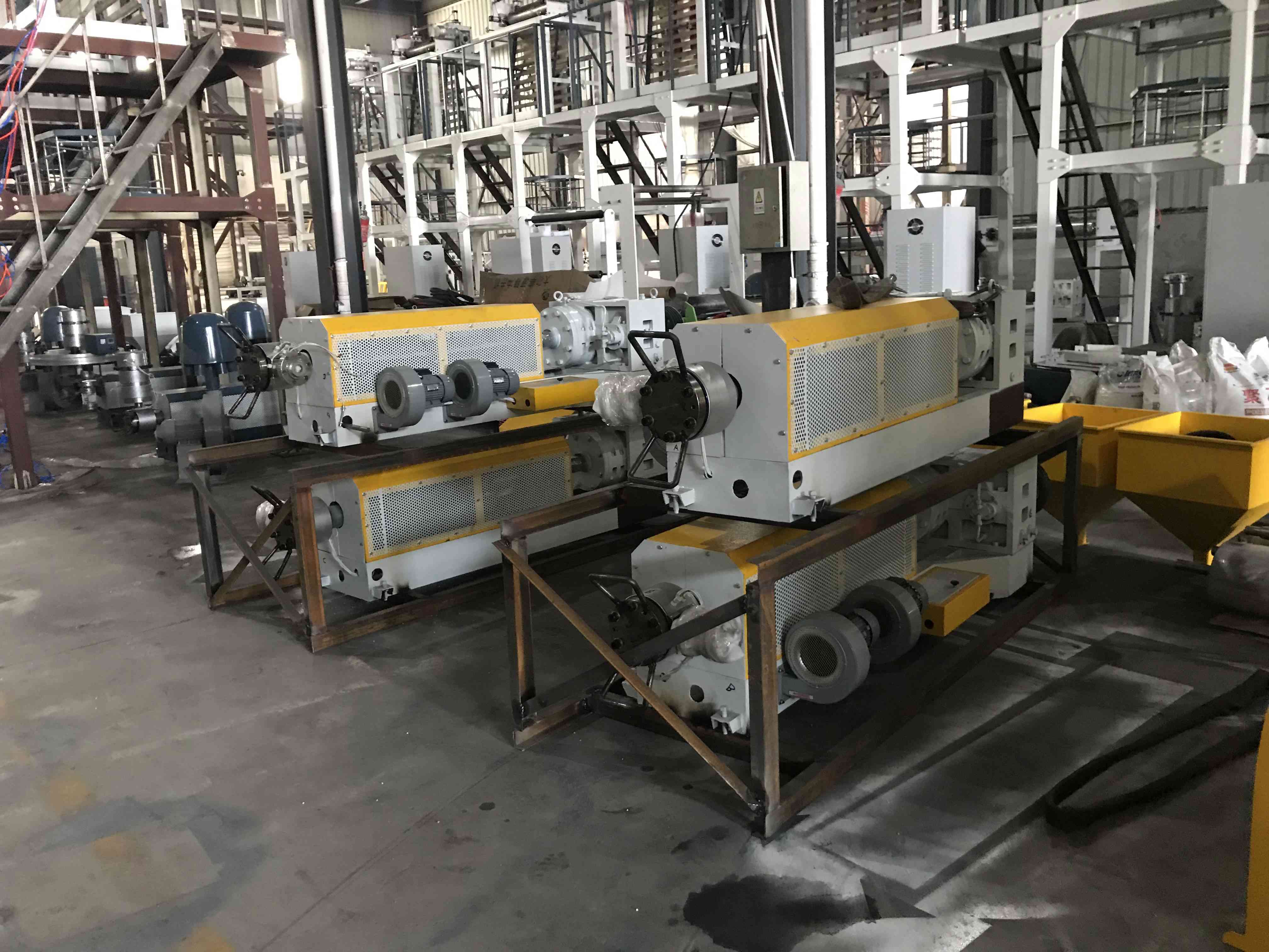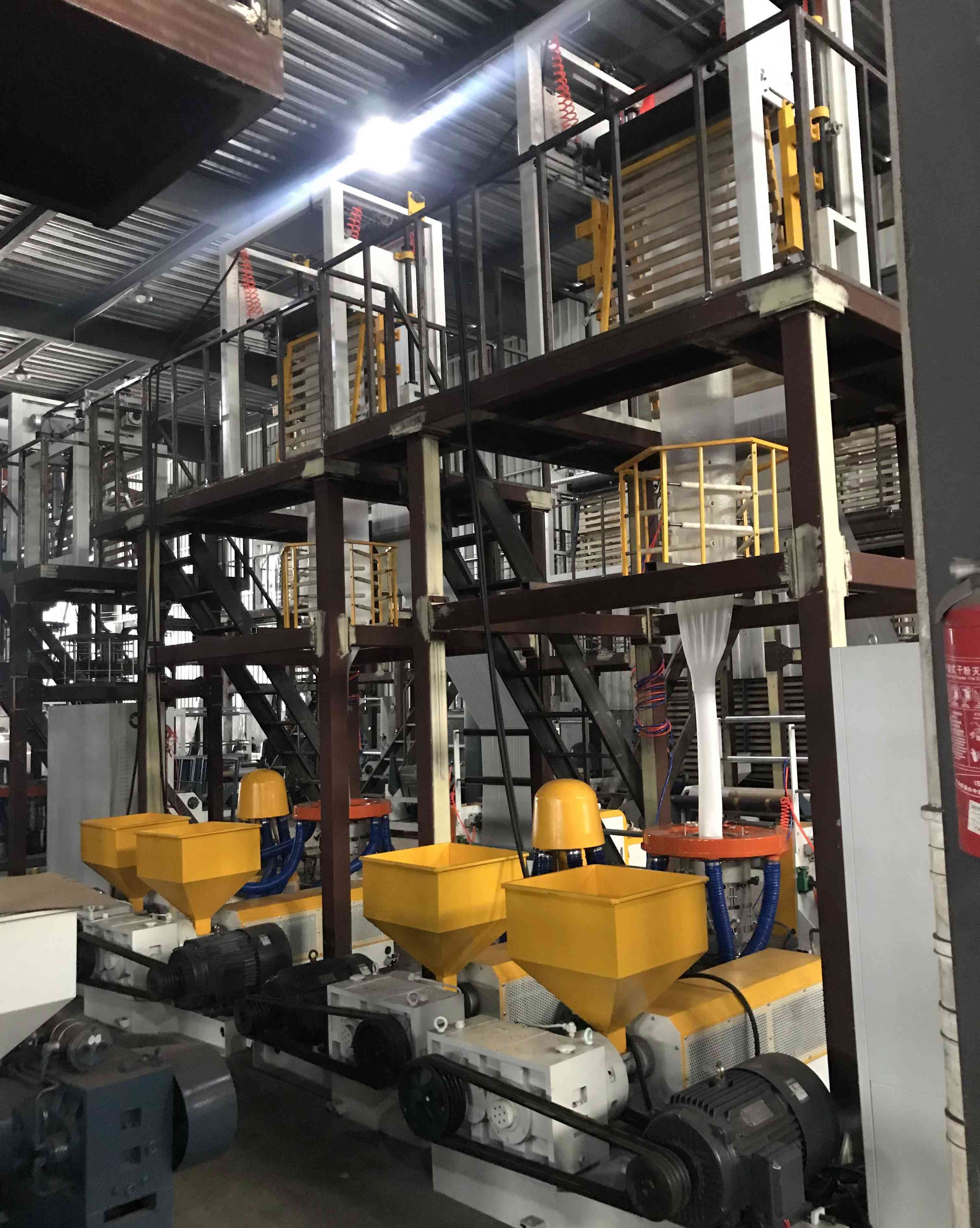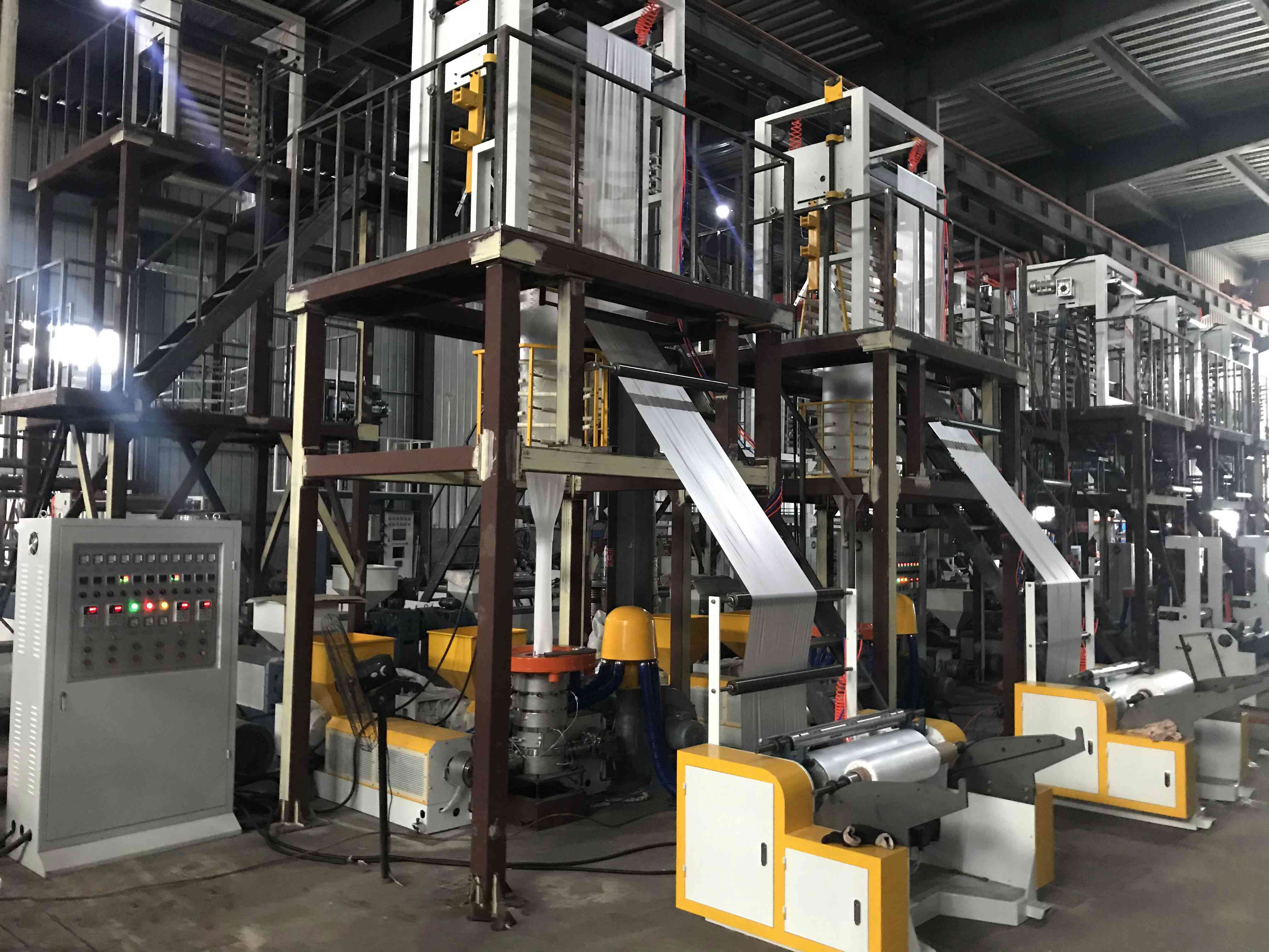 The ABA film blowing machines can make the film is 30% stronger than one layer film, and production cost can be saved up to 50%. Based on the unique screw design, up to 80% CaCo3 can be added to machine with excellent mixing effect.