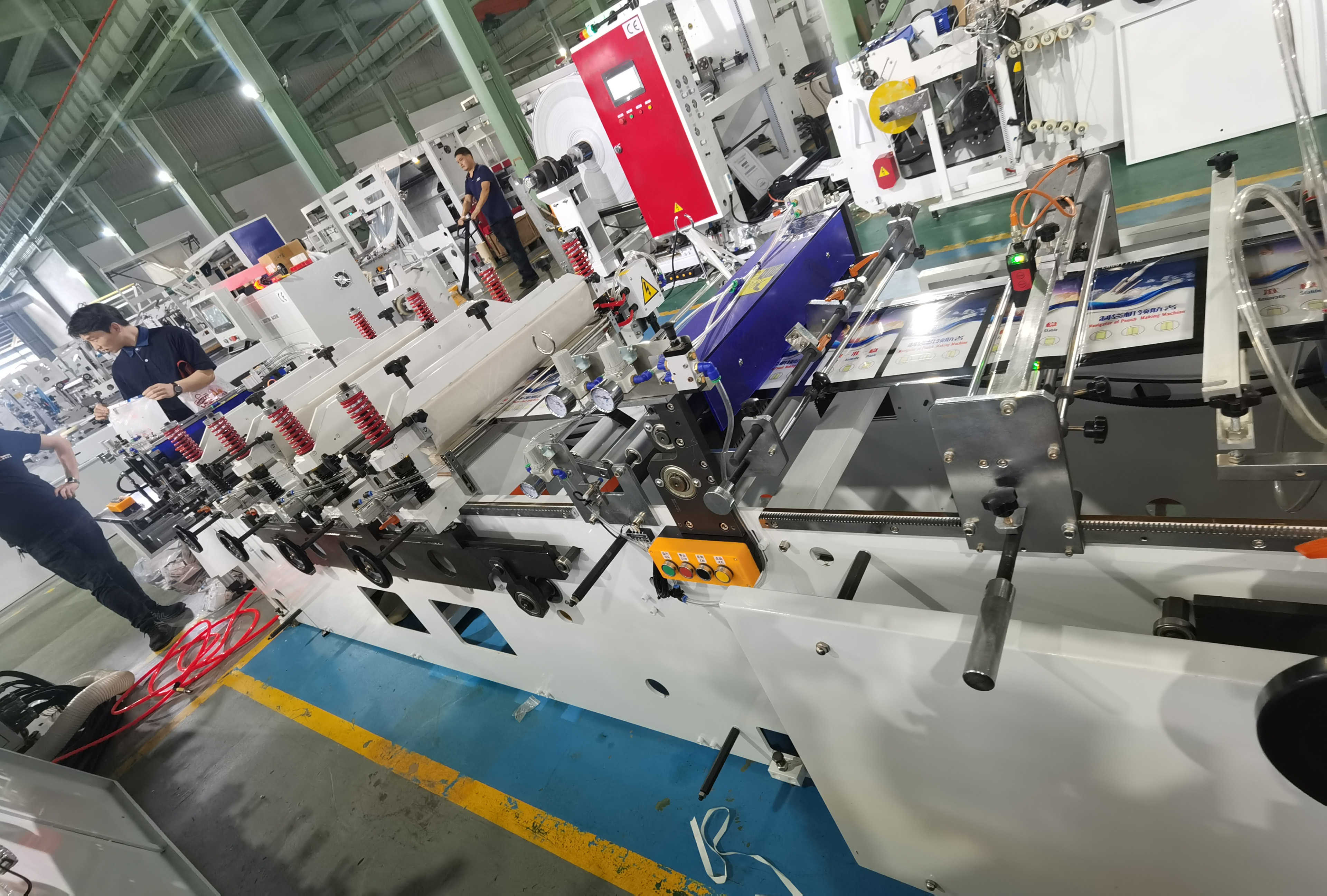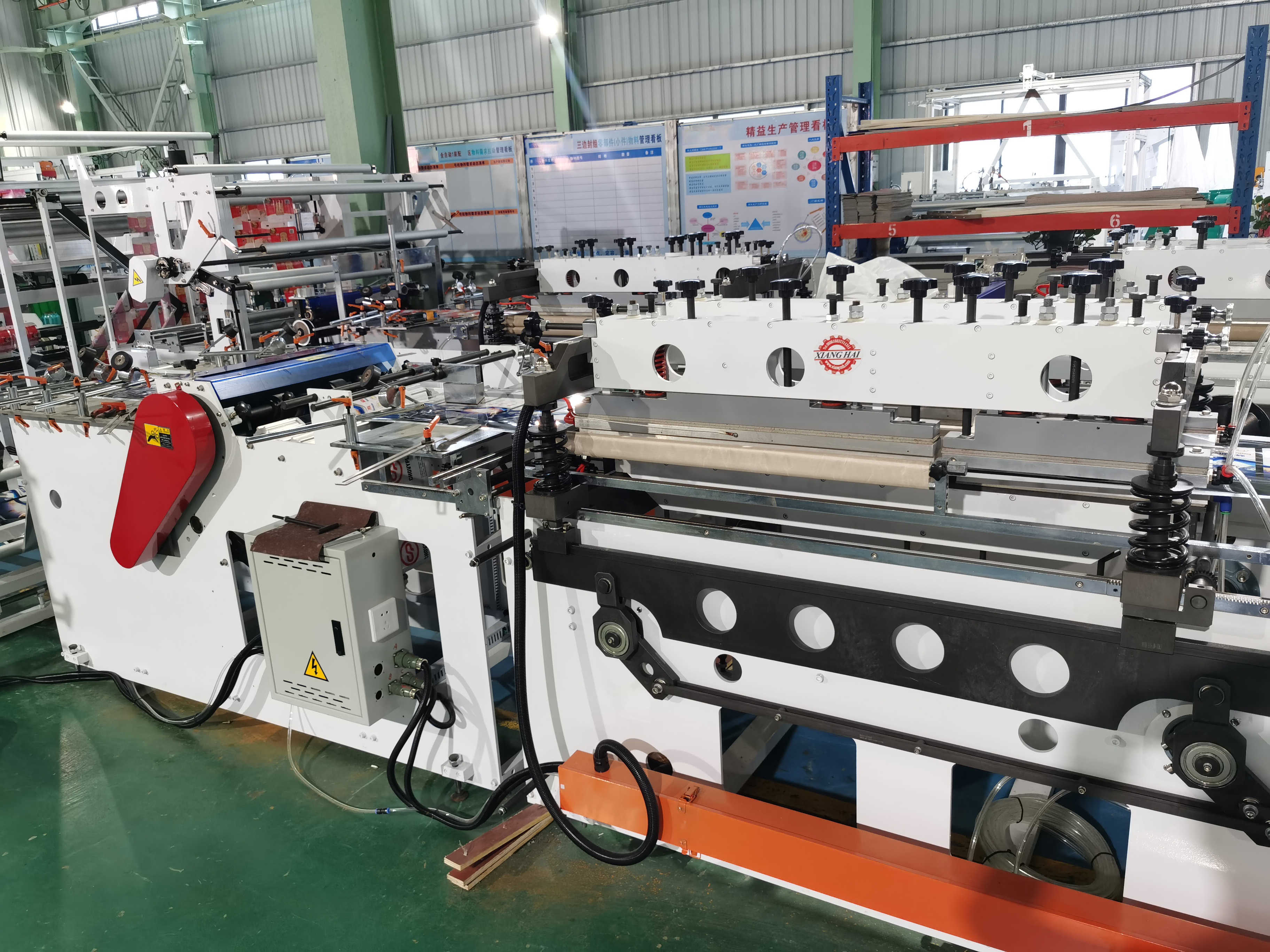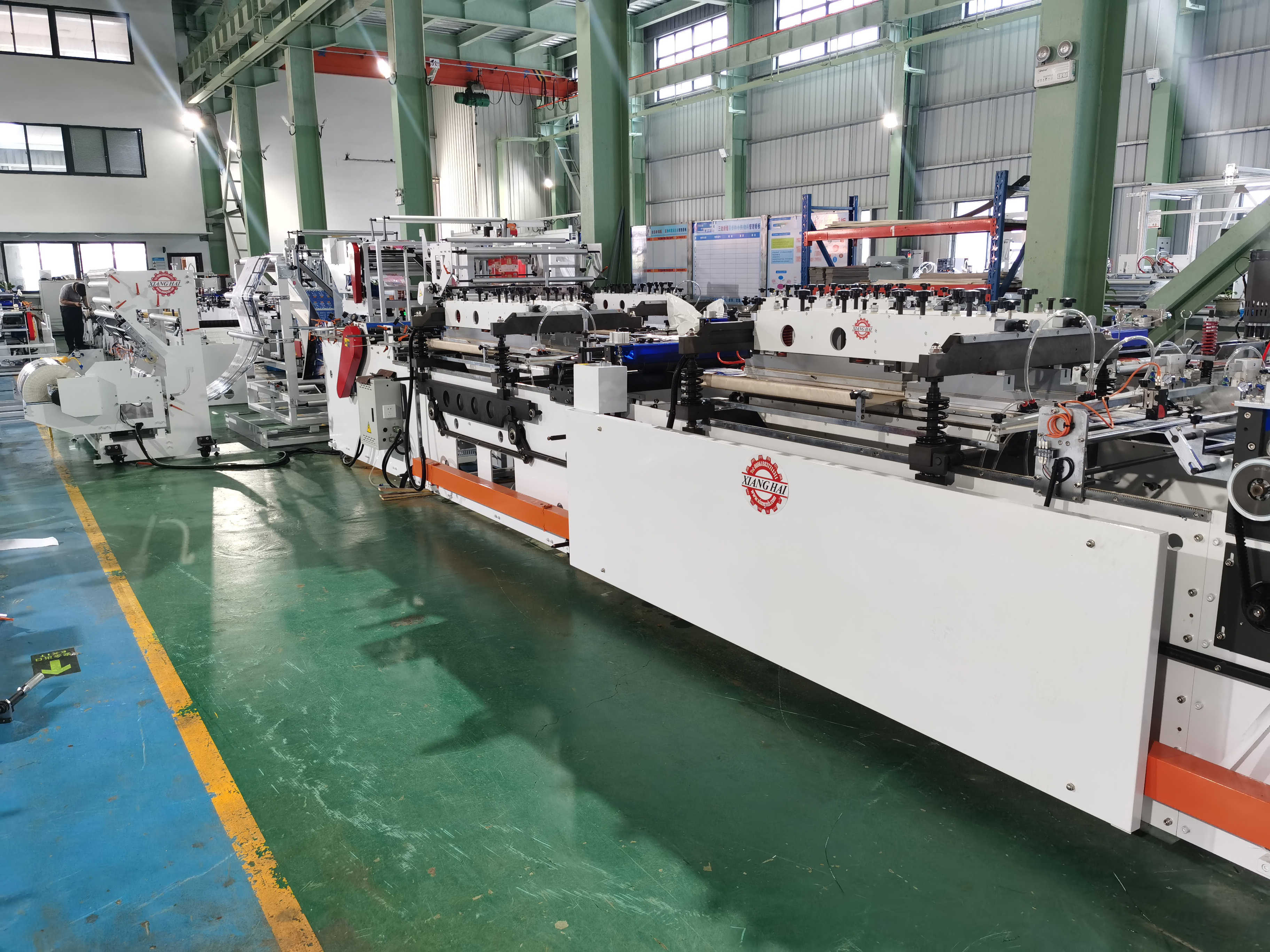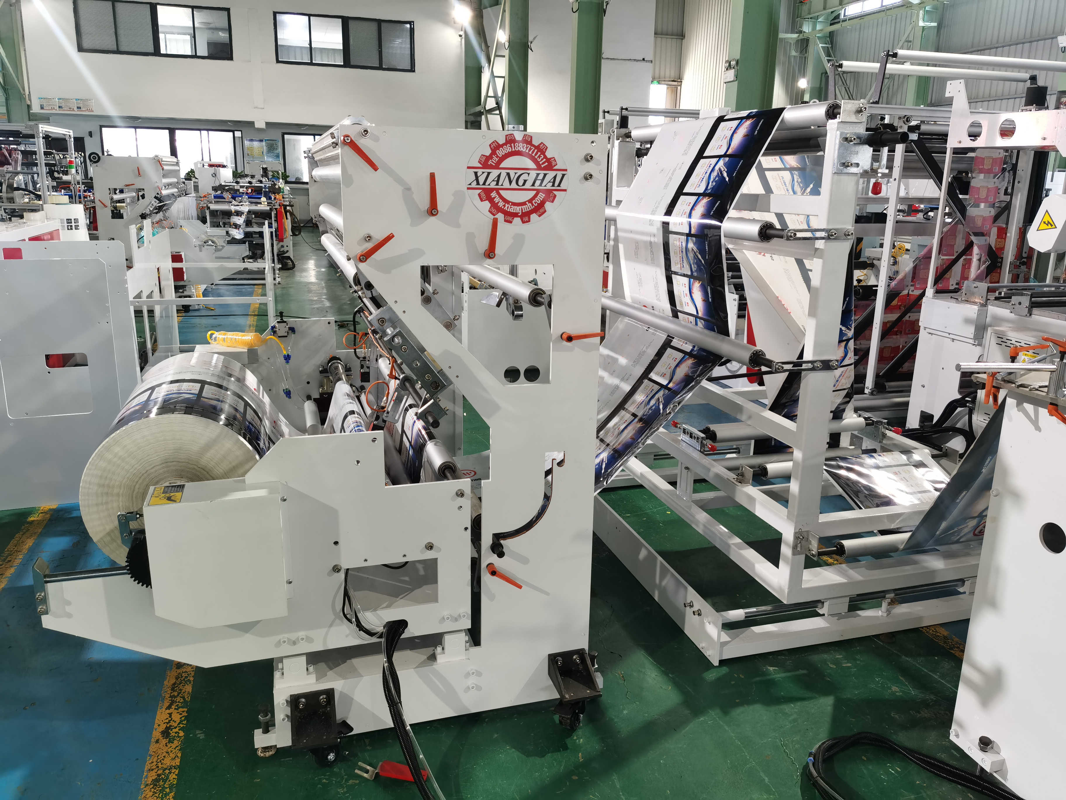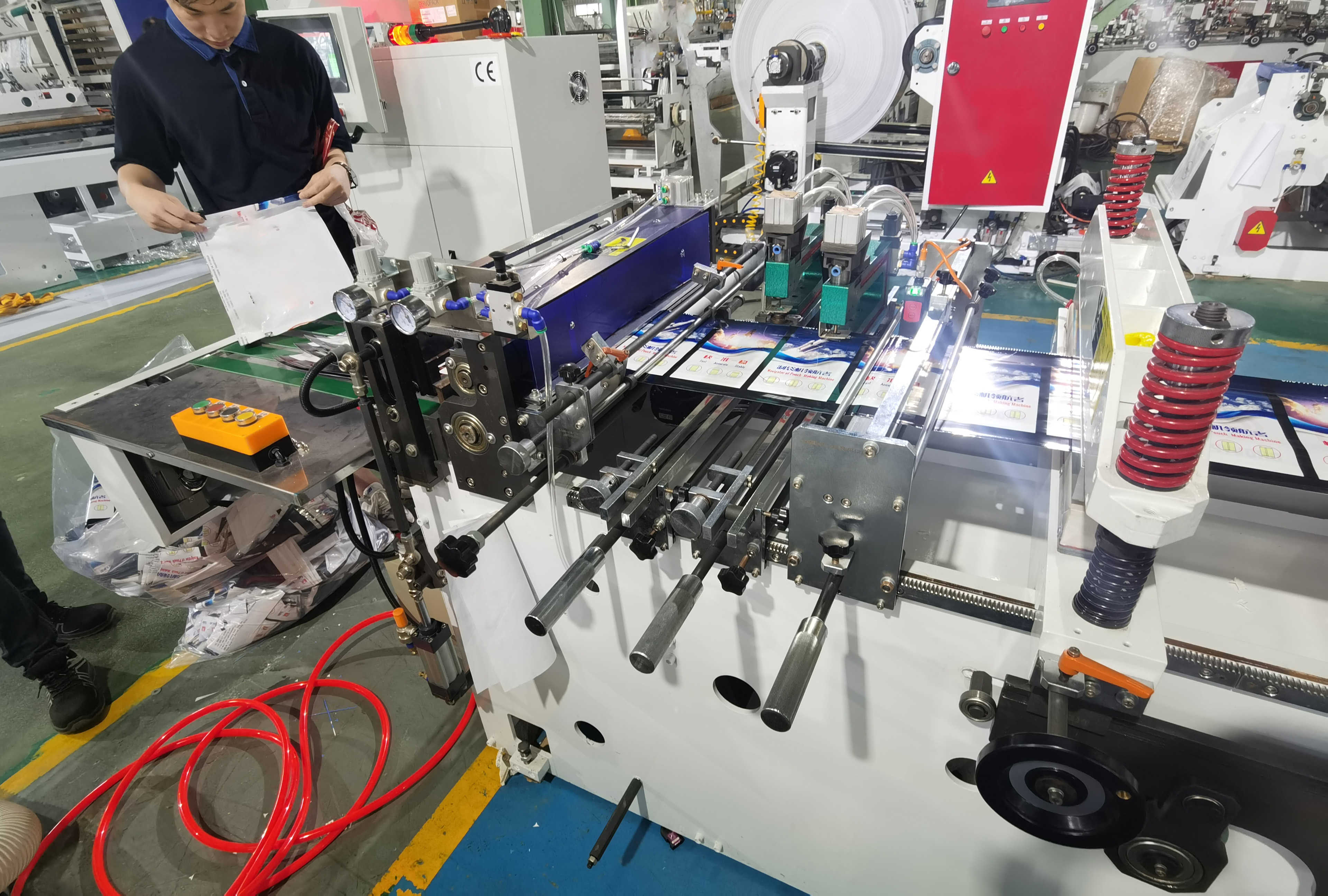Four side sealing bag making machine adopts PLC microcomputer control, double servo and double frequency control, photoelectric monitoring and correction, pneumatic transmission and other technologies, integrated with the machine photoelectric, automatic unwinding, cutting, tension adjustment control system, five rows of bridge type longitudinal sealing scalding knife heat sealing and circulating water cooling bonding device, heating temperature Pc control, according to the need to add a variety of special-shaped bag auxiliary bag making device.