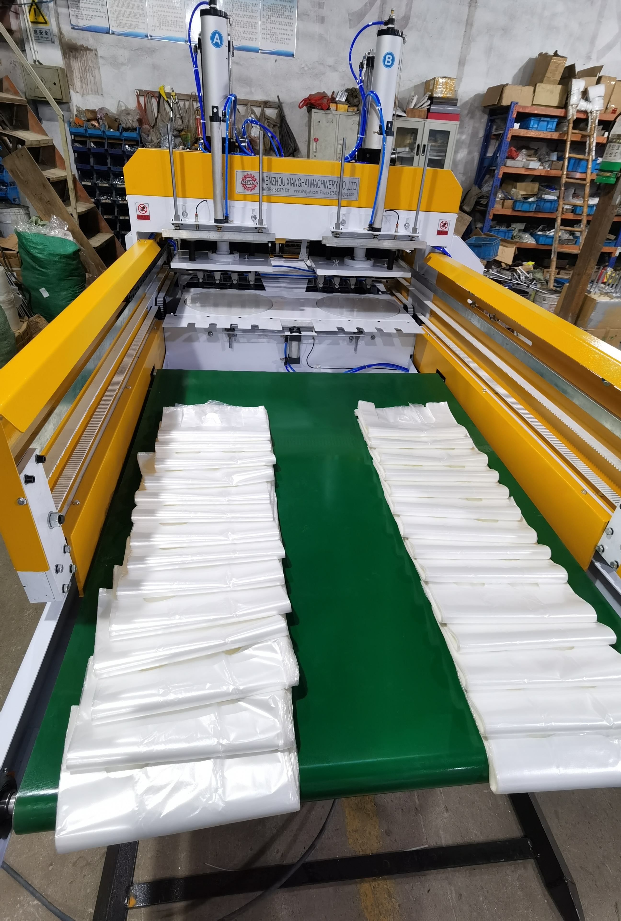 automaticlly,also the machine is with photocell, automatic material feeding device,automatic constant temperature control device, electrostatic removing device,automatic counting and alarm device etc.It's easy operation, stable performance and with high producing speed. This machine is the best machine to make T-shirt bag if you want to save labor.