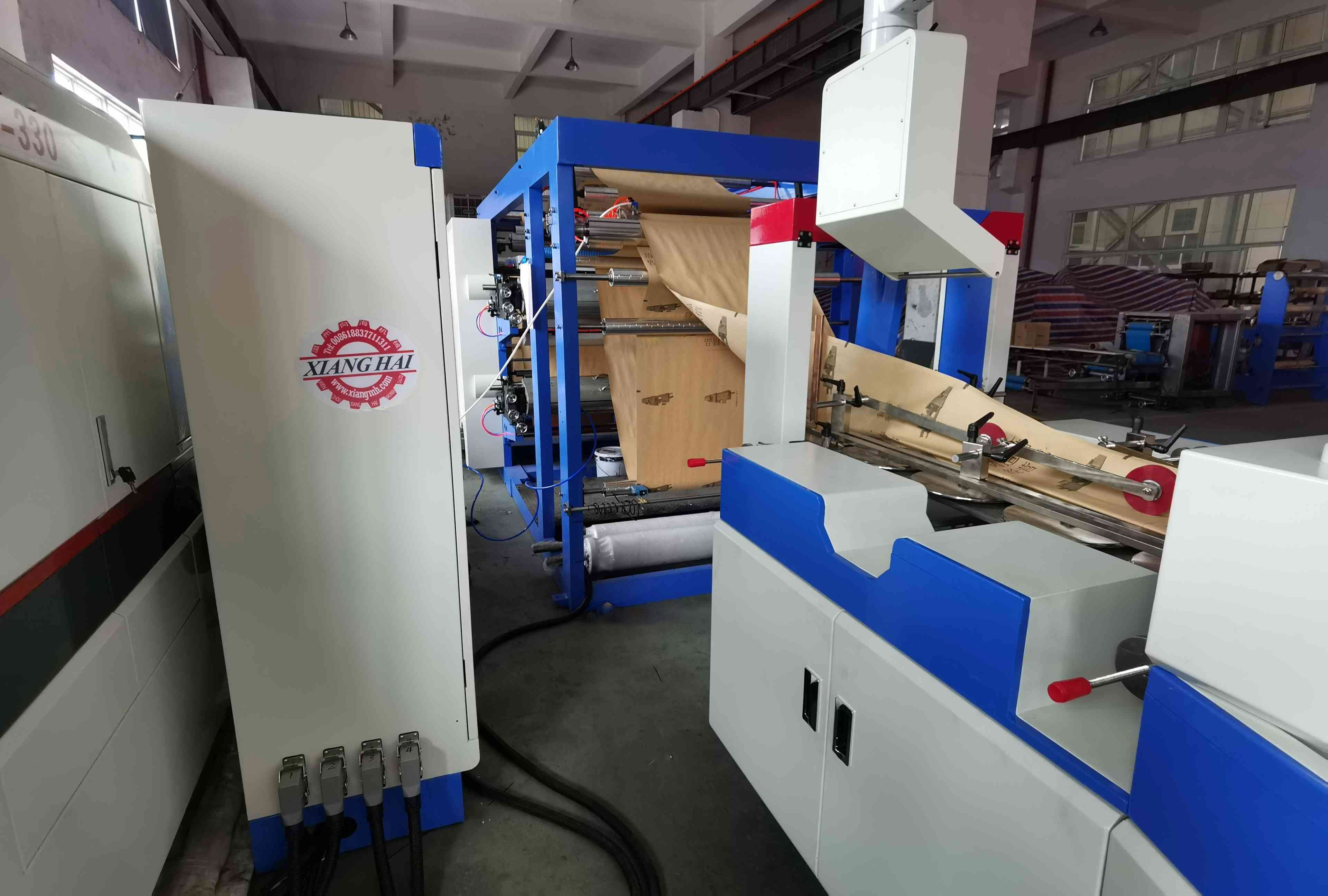 This machine features a continuous function of automatic paper suction, gluing,creasing,bottom sticking and bag formation at a stroke.The machine has automatic force controlling machine and the function of color marking tracking. All the operation procedures are controlled by PLC,saving labor force.