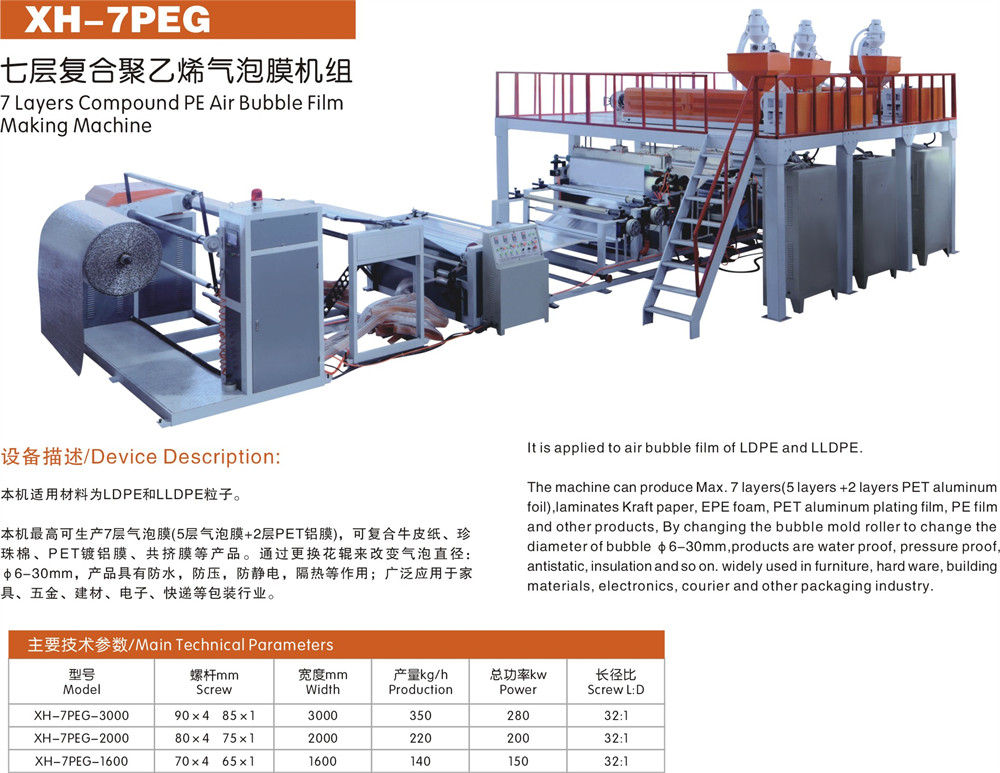 This machine is mainly composed of extruder, die, vacuum negative pressure system, bubble forming mold, traction mechanism, rolling flat body, winding mechanism, electrical control system. Add raw material from loader port until the finished product winder. Compound air bubble film machine adopts instant molding process, is desioned on base of machine. Kraft paper, PE film, pearl cotton, PET aluminum plating film can compound the surface of air bubble film and connect mold instantly. It has scientific, reasonable and practical design.